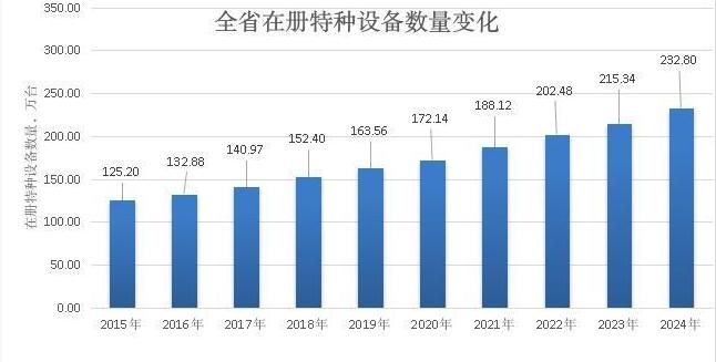 截至2024年底,全省在册特种设备共计232.80万台(套),比2023年增加了8.11%。其中,锅炉2.96万台、压力容器47.49万台、电梯132.21万台、起重机械22.14万台、客运索道26条、大型游乐设施2121台(套)、场(厂)内专用机动车辆27.79万台,气瓶5623万只,压力管道3.81万千米。